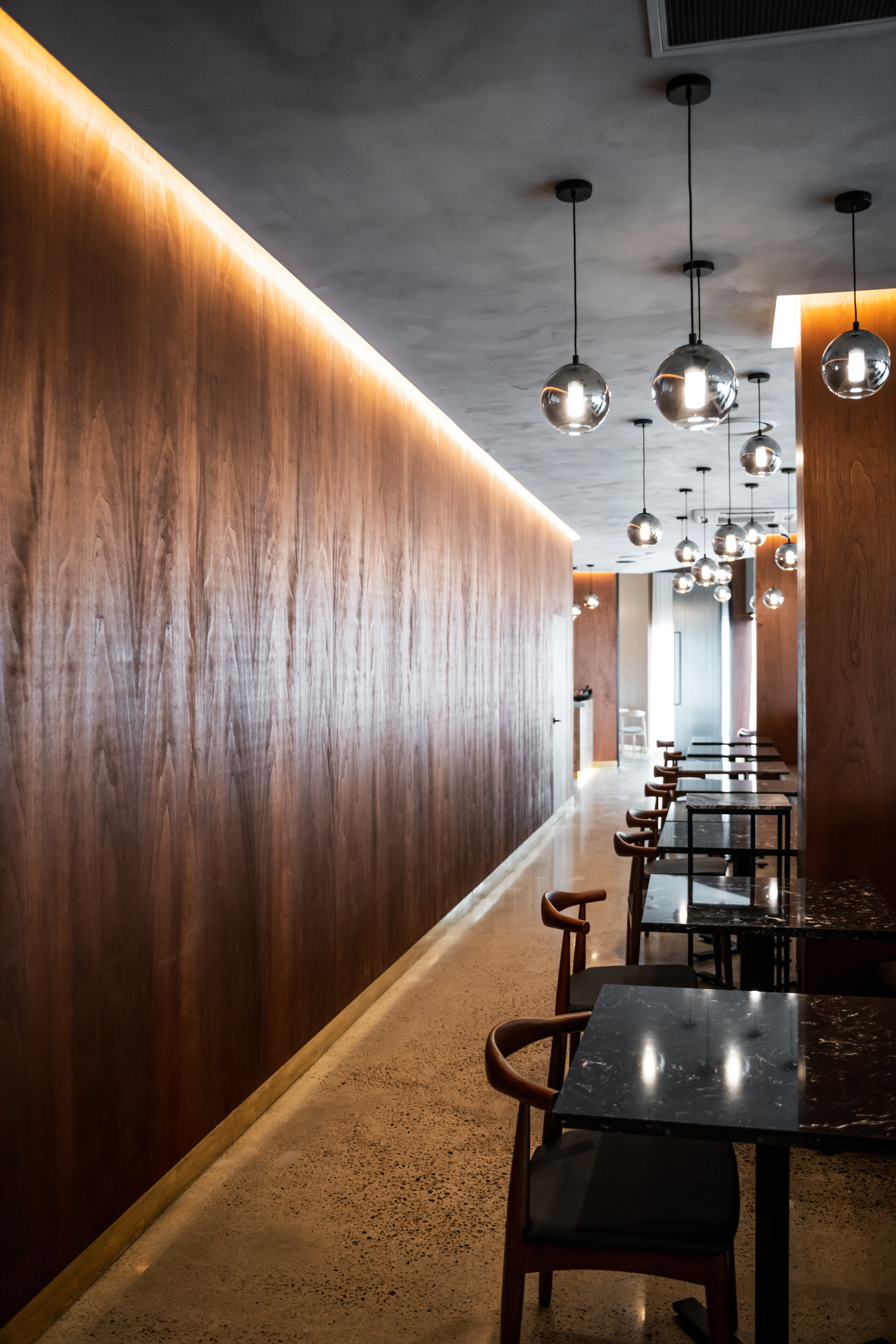 The client required a full suite of custom joinery that would bring warmth, texture, and contrast to the space. The goal was to evoke traditional Japanese craftsmanship while embracing contemporary edge through bold materiality. The joinery needed to align with the brand’s identity and support practical use across multiple high-traffic hospitality zones.