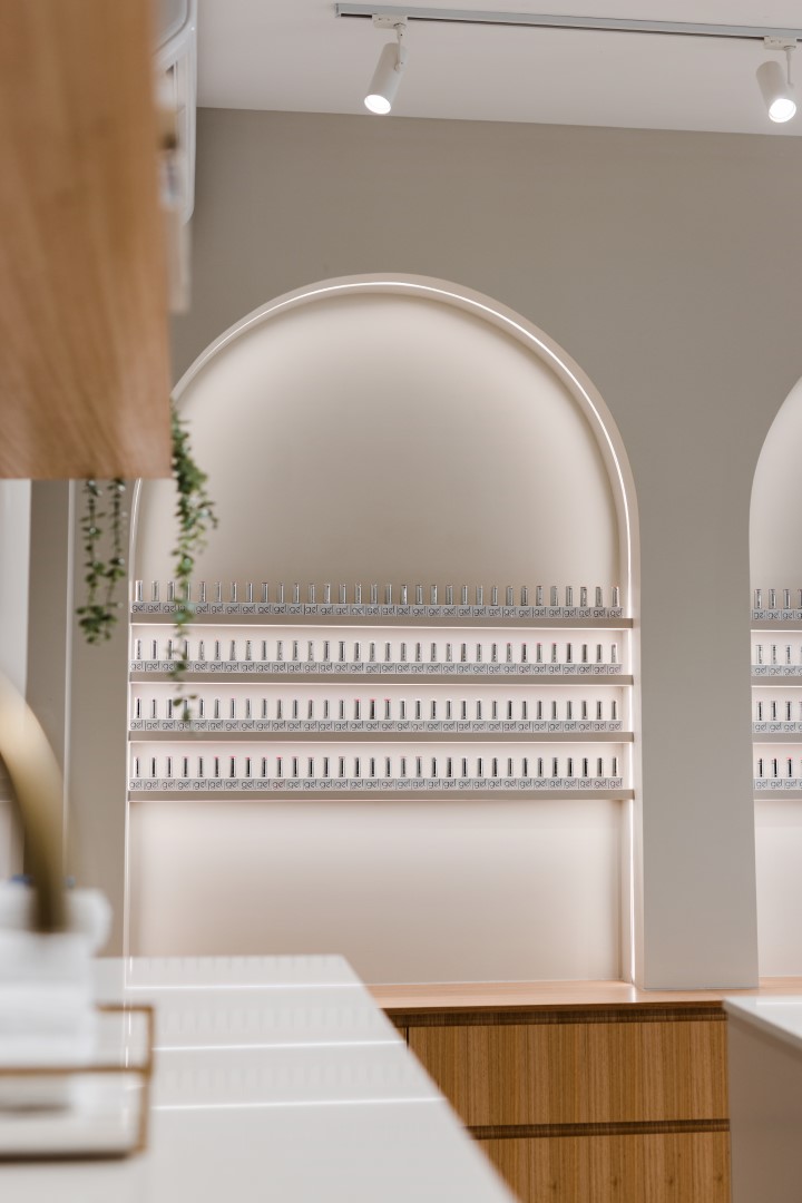 Oni Joinery designed and built a range of custom cabinetry and aesthetic elements for Gloss Nail Lounge in Milton. This project features elegant floating shelves, seamless storage solutions, and striking architectural features such as custom pillars and a statement feature wall. By integrating premium materials and precision craftsmanship, the joinery enhances both the salon’s functionality and its refined aesthetic.