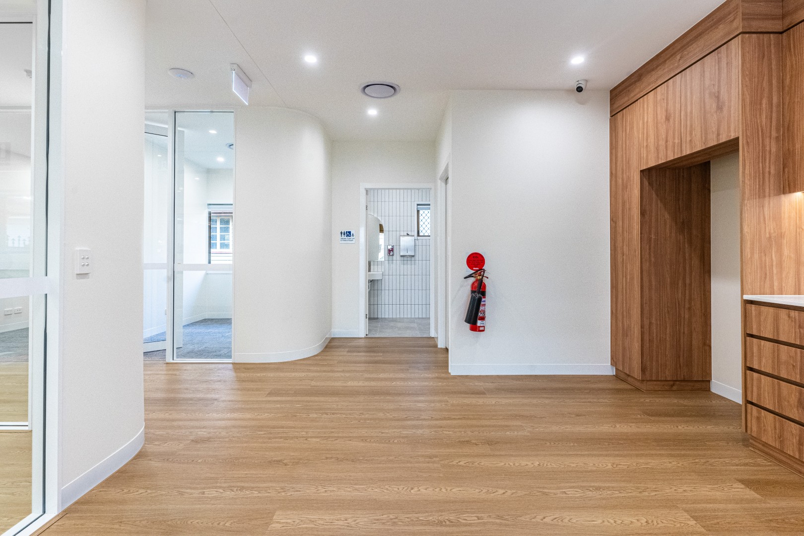 We crafted and installed a range of custom cabinetry solutions tailored to each space. In the kitchenettes, timber joinery with integrated storage is paired with stone benchtops and gold tapware, balancing utility with elegance. The reception area features a curved timber counter that softens the space and welcomes visitors. Office cabinetry and hallway storage continue the warm timber palette, with clean lines and concealed handles for a streamlined finish. Every piece was manufactured in-house and installed with precision to achieve consistency across the entire fitout.